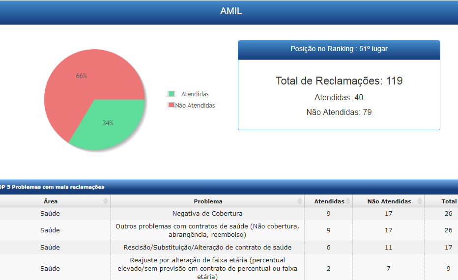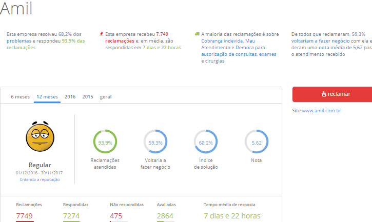 No Reclame Aqui, a Amil ficou com 7.749 reclamações no período de 01/12/2016 até 30/11/2017.